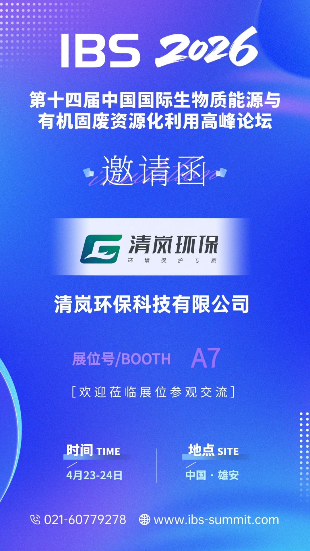 清岚环保科技有限公司位于河北省石家庄市高新区。公司自2011年成立以来先后被评为高新技术企业、科技型中小企业、科技创新型企业,取得环保工程专业承包贰级施工资质,安全生产许可证,ISO9001、ISO14001、ISO45001、GBT50430体系认证,拥有多项专利、软著、商标、企业标准。 公司主营项目: 硫化氢专项 (天然气脱硫,瓦斯脱硫,石化加氢脱硫,络合铁脱硫,脱硫剂) 沼气净化利用(沼气脱硫,沼气脱碳,生物质天然气CNG) 污水厌氧设备(三相分离器,溢流堰,水封罐,气液分离罐) 三相分离器(厌氧生化,厌氧氨氧化,缺氧好氧A/O等工艺气固液分离) 除臭系统 (化学除臭,生物除臭,吸收塔,生物滤床,活性炭箱) 近年来随着国家“双碳”目标的提出,推广沼气工程已成为实现绿色能源利用和减缓气候变化的重要举措之一,在推动社会经济绿色循环发展、农业废弃物资源化、无废城市建设和工业减污降碳等方面发挥了重要作用。清岚环保致力于“绿水青山,就是金山银山”的发展目标,专注沼气利用领域技术的不断改革创新,力争为企业减排及改善生态环境贡献自己的一份力量。 一、河南驻马店鸡粪牛粪+秸秆厌氧沼气 脱硫脱碳CNG 沼气30000m3/d 进口H2S 8000ppm 出口H2S≤10ppm 二、江苏某垃圾渗滤液项目 沼气25000m3/d H2S12000ppm 沼气脱硫后提纯制天然气 三、湖北鄂州养猪场污水厌氧沼气 脱硫后锅炉蒸汽发电 沼气96000m3/d 进口H2S 7500ppm 出口H2S≤10ppm 四、四川餐厨垃圾厌氧系统一期、二期,沼气脱硫后发电利用 沼气20000m3/d 进口H2S 2000ppm 出口H2S≤10ppm 五、广西桂林制药厂污水厌氧沼气 脱硫后锅炉蒸汽利用 沼气30000m3/d 进口H2S 40000+ppm 出口H2S≤10ppm 六、广东某生物科技企业污水站沼气+臭气 脱硫后达标排放 沼气3600m3/d 进口H2S 30000ppm 出口H2S<20ppm 臭气10000m3/d 进口H2S 450ppm 出口H2S<5ppm | 联系我们 联系人:范女士 手 机:18158866162(微信同号) 电 话:021-60779278 邮 箱:Fantasty.fan@wanhoo.org.cn 网 站:www.ibs-summit.com 展位有限,预定从速 已预定 未预定 扫码报名参会 | 报名享受优惠 | IBS 2026 第十四届中国国际生物质能源与 有机固废资源化利用高峰论坛 邀您参会! 扫描二维码 关注我们 IBS 环保视界 了解更多大会动态